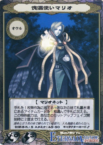 ![]() ![]() | No.2012 傀儡使いマリオ キャラクター エターナルヴォイス エヴォリューション ブースターパック R クラス:オウル 初期手札:5 スタミナ:45-50 性別:♂ 格闘回数:0 魔法回数:3 属性:地 【マリオネット】 手札を1枚無作為に捨てる:あなたの捨て札置き場にあるアイテムカードを1枚選んで手札に加える。 この能力は、あなたのセットアップフェイズ開始時に2度まで行える。 運命という名の糸で縛られている限り、人も傀儡も変わらない。 illust:HIKI Yu 作品名:エターナルヴォイス エヴォリューション |
