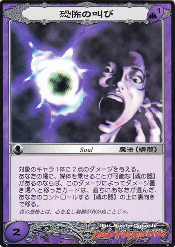 ![]() ![]() | No.3128 恐怖の叫び 魔法 竜創騎兵ドラグーン ブースターパック C 属性:闇 種類:瞬間 副属性:Soul レベル:1 ダメージ:2 対象アイコン:キャラクター 対象のキャラ1体に2点のダメージを与える。 あなたの場に、媒体を乗せることが可能な【魂の器】があるのならば、このダメージによってダメージ置き場へと移ったカードは、直ちにあなたが選んだ、あなたのコントロールする【魂の器】の上に裏向きで移る。 真の恐怖とは、心を乱し制御が利かぬことじゃ。 illust:Naoto Oohashi 作品名:竜創騎兵ドラグーン |