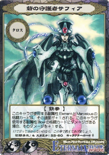 ![]() ![]() | No.2017 砦の守護者サフィア キャラクター エターナルヴォイス エヴォリューション ブースターパック R クラス:タロス 初期手札:4 スタミナ:55-60 性別:♀ 格闘回数:3 魔法回数:0 属性:水/火 【鉄拳】 このキャラが使用する副属性ElementとMarvelousの格闘カードは、その速度が+1される。このキャラが使用する副属性Blowの格闘カードにダメージがある場合、そのダメージを+1する。 口で言って分からないのなら、この拳で教えてあげましょう。 illust:Norikatsu Miyoshi 作品名:エターナルヴォイス エヴォリューション |