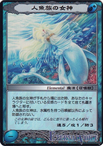 ![]() ![]() | No.0014 人魚族の女神 魔法 プロモーションカード (foil) 属性:水 種類:召喚獣 副属性:Elemental レベル:4 攻撃力:1 防御力:3 速度:5 人魚族の女神が手札から場に出た時、あなたのキャラクターに付いている反感カードを全て捨て札置き場へと移す。 人魚族の女神は、水属性を持つ召喚獣以外によって防御されない。 この女神の前では、どんな怒りに曇った心も晴れてしまう。 illust:HIKI Yu 作品名:エターナルヴォイス |