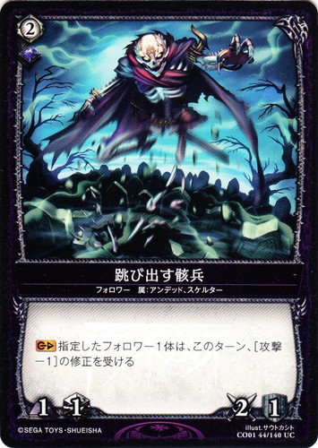 ![]() ![]() | CO01 44 跳び出す骸兵 フォロワー 鳴動編 拡張パック 第1弾 UC 所属:ヴァルデン コスト:(2)黒 種属:アンデッド、スケルター クラッシュ:1 キャプチャー:1 攻撃:2 耐久:1 【CIP】指定したフォロワー1体は、このターン、[攻撃-1]の修正を受ける illust:サウトガシト |