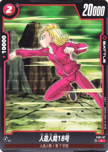 ![]() ![]() | FS01-07 人造人間18号 バトル スタートデッキ 孫悟空 C 色:赤 コスト:②[赤1] パワー:20000 コンボパワー:+10000 特徴:人造人間/第7宇宙 |