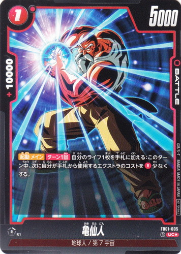 ![]() ![]() | FB01-005 亀仙人 バトル バトルパック01 UC* 色:赤 コスト:①[赤1] パワー:5000 コンボパワー:+10000 特徴:地球人/第7宇宙 【起動 メイン】【ターン1回】自分のライフ1枚を手札に加える:このターン中、次に自分が手札から使用するエクストラのコストを[赤]少なくする。 |