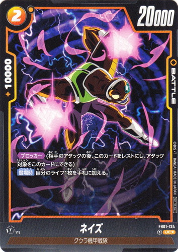 ![]() ![]() | FB01-128 フリーザ バトル バトルパック01 UC* 色:黄 コスト:②[黄1] パワー:15000 コンボパワー:+10000 特徴:フリーザ一族/フリーザ軍 【起動 メイン】このカードをレスとにする:自分の手札のコスト1以下の特徴《フリーザ軍》を持つバトルカード1枚までを登場させる。 |