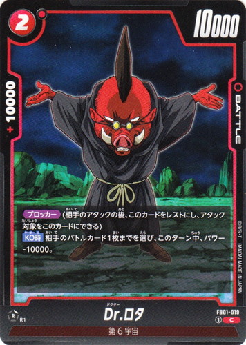 ![]() ![]() | FB01-019 Dr.ロタ バトル ブースターパック 覚醒の鼓動 C 色:赤 コスト:②[赤1] パワー:10000 コンボパワー:+10000 特徴:第6宇宙 【ブロッカー】(相手のアタックの後、このカードをレストにし、アタック対象をこのカードにできる) 【KO時】相手のバトルカード1枚までを選び、このターン中、パワー-10000。 |