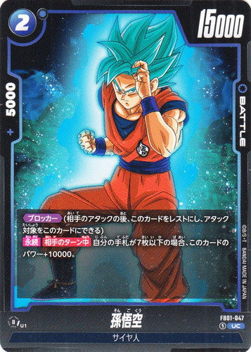 ![]() ![]() | FB01-047 孫悟空 バトル ブースターパック 覚醒の鼓動 UC 色:青 コスト:②[青1] パワー:15000 コンボパワー:+5000 特徴:サイヤ人 【ブロッカー】(相手のアタックの後、このカードをレストにし、アタック対象をこのカードにできる) 【永続】【相手のターン中】自分の手札が7枚以下の場合、このカードのパワー+10000。 |
