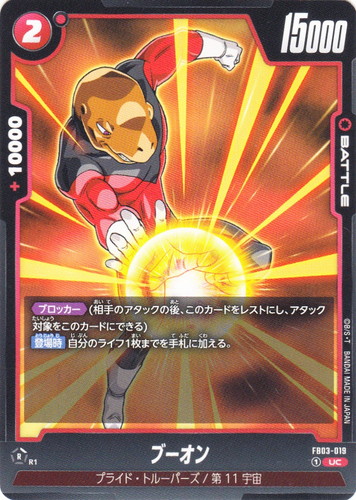 ![]() ![]() | FB03-131 魔人ブウ:GT バトル ブースターパック 怒りの咆哮 C 色:黒 コスト:①[黒1] パワー:5000 コンボパワー:+10000 特徴:魔人 【ブロッカー】(相手のアタックの後、このカードをレストにし、アタック対象をこのカードにできる) |