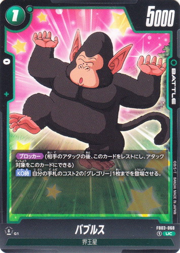 ![]() ![]() | FB03-068 バブルス バトル ブースターパック 怒りの咆哮 UC 色:緑 コスト:①[緑1] パワー:5000 コンボパワー:+0 特徴:界王星 【ブロッカー】(相手のアタックの後、このカードをレストにし、アタック対象をこのカードにできる) 【KO時】自分の手札のコスト2の「グレゴリー」1枚までを登場させる。 |