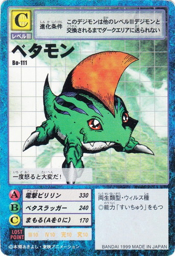 ![]() ![]() | Bo-111 ベタモン デジモン ブースター3 フィールド:ネイチャースピリッツ 種族:両生類型 属性:ウィルス種 バトルタイプ:C レベル:レベルIII ロストポイント:III10 IV10 完10 究10 【攻撃】 【A】電撃ビリリン 330 【B】ベタスラッガー 240 【C】まもる(Aを0に) 170 進化条件:このデジモンは他のレベルIIIデジモンと交換されるまでダークエリアに送られない ◎能力「すいちゅう」をもつ 一度怒ると大変だ! |