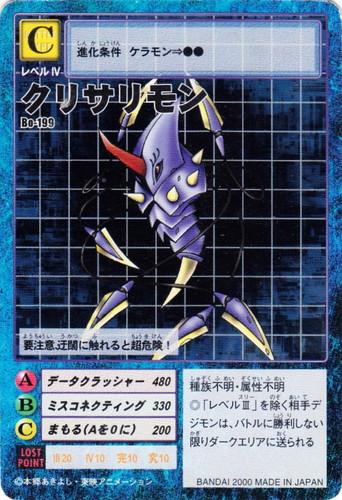 ![]() ![]() | Bo-199 クリサリモン デジモン ブースター4 フィールド:ダークエリア 種族:種族不明 属性:属性不明 バトルタイプ:C レベル:レベルIV ロストポイント:III20 IV10 完10 究10 【攻撃】 【A】データクラッシャー 480 【B】ミスコネクティング 330 【C】まもる(Aを0に) 200 進化条件:ケラモン⇒●● ◎「レベルIII」を除く相手デジモンは、バトルに勝利しない限りダークエリアに送られる 要注意、迂闊に触れると超危険! |