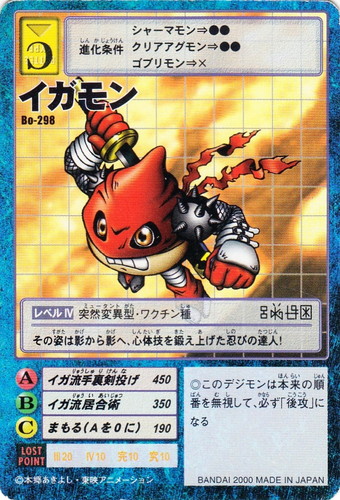![]() ![]() | Bo-298 イガモン デジモン ブースター6 フィールド:アンノウン 種族:突然変異型 属性:ワクチン種 バトルタイプ:C レベル:レベルIV ロストポイント:III20 IV10 完10 究10 【攻撃】 【A】イガ流手裏剣投げ 450 【B】イガ流居合術 350 【C】まもる(Aを0に) 190 進化条件 シャーマモン⇒●● クリアアグモン⇒●● ゴブリモン⇒×× ◎このデジモンは本来の順番を無視して、必ず「後攻」になる その姿は影から影へ、心体技を鍛え上げた忍びの達人! |
