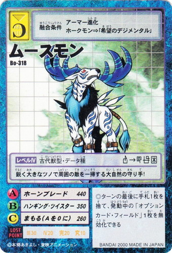 ![]() ![]() | Bo-318 ムースモン デジモン ブースター7 戦慄の皇帝竜 フィールド:ネイチャースピリッツ 種族:古代獣型 属性:データ種 バトルタイプ:C レベル:レベルIV ロストポイント:III30 IV20 完20 究10 【攻撃】 【A】ホーンブレード 440 【B】ハンギング・ツイスター 350 【C】まもる(Aを0に) 260 進化条件 アーマー進化 ホークモン⇒「希望のデジメンタル」 ◎ターンの最後に手札1枚を捨て、発動中の「オプションカード・フィールド」1枚を無効化できる 鋭く大きなツノで周囲の敵を一掃する大自然の守り手! |
