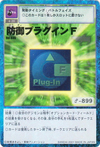 ![]() ![]() | Bo-446 防御プラグインF オプション ブースター9 白き聖剣の煌芒 タイプ:アイテム ポイント:+20 発動タイミング:バトルフェイズ ◎このカードは1枚しかスロットに置けない 効果:◎自分のデジモンは相手「オプションカード・フィールド」の効果を受けなくなる。その後、自分の手札を1枚選んでダークエリアに送る ◎カードは使用したターン終了時、ダークエリアに送られる |