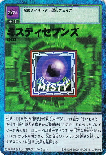 ![]() ![]() | St-213 ミスティセブンズ オプション スターターセットVer.4 タイプ:アイテム ポイント:+20 発動タイミング:進化フェイズ 効果:◎「自分」か「相手」か「双方」のデジモンは能力「すいちゅう」を得る(誰が能力を得るかは発動時にこのカードを出したプレイヤーが決める) ◎カードは「自分で捨てる」か「相手に無効化」されスロットから取り除かれる、又は自分のデジモンが「寿命を迎える」までスロットに残り、効果を発揮する |