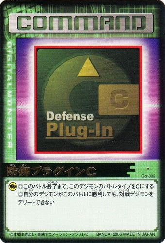 ![]() ![]() | Cα-002 防御プラグインC コマンド Evolve.1 R 星:1 ◎このバトル終了まで、このデジモンのバトルタイプをCにする ◎自分のデジモンがこのバトルに勝利しても、対戦デジモンをデリートできない |