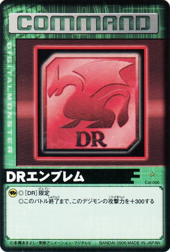 ![]() ![]() | Cα-006 DRエンブレム コマンド Evolve.1 C 星:1 ◎[DR]限定 ◎このバトル終了まで、このデジモンの攻撃力を+300する |