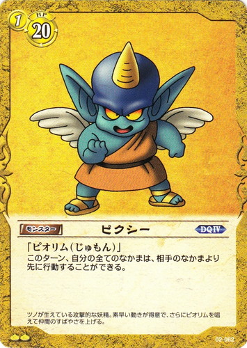 ![]() ![]() | 02-062 ピクシー なかま ブースターパック 第2弾 進化の秘法編 U 色:黄 種類:モンスター レベル:1/HP:20 「ピオリム(じゅもん)」このターン、自分の全てのなかまは、相手のなかまより先に行動することができる。 ツノが生えている攻撃的な妖精。素早い動きが得意で、さらにピオリムを唱えて仲間のすばやさを上げる。 作品名:DQ IV |