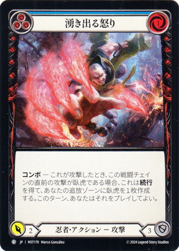 ![]() ![]() | MST177 湧き出る怒り アクション 霧隠の秘境 C クラス:忍者 サブタイプ:攻撃 ピッチ値:(赤)(赤) リソースポイント:赤1 ATK:3 DEF:3 カラーストリップ:黄 コンボーこれが攻撃したとき、この戦闘チェインの直前の攻撃に臥虎である場合、これは続行を得て、あなたの追放ゾーンに臥虎を1枚作成する。このターン、あなたはそれをプレイしてよい。 illust:Marco Gonzalez |