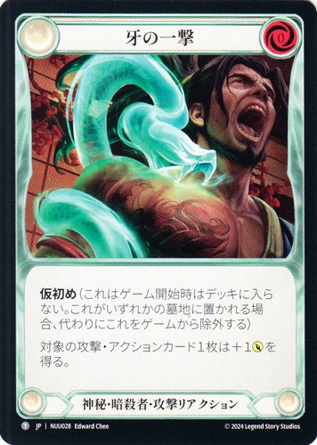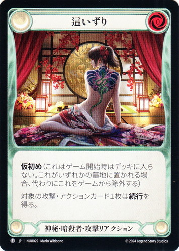 ![]() ![]() | NUU029 這いずり 攻撃リアクション 霧隠の秘境 ブリッツデッキ ヌゥ T クラス:神秘・暗殺者 リソースポイント:赤0 仮初め(これはゲーム開始時はデッキに入らない。これがいずれかの墓地に置かれる場合、代わりにこれをゲームから除外する) 対象の攻撃・アクションカード1枚は続行を得る。 両面:牙の一撃 illust:Mario Wibisono |