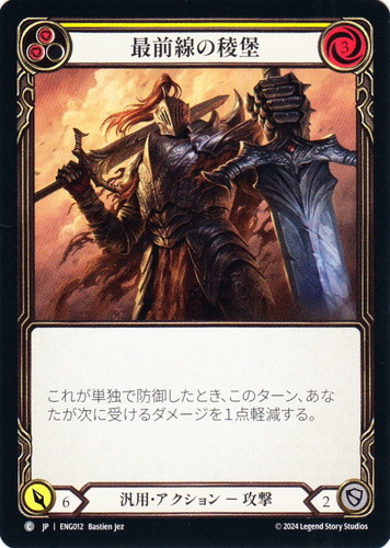 ![]() ![]() | ENG012 最前線の稜堡 アクション 霧隠の秘境 ブリッツデッキ エニグマ C クラス:汎用 サブタイプ:攻撃 ピッチ値:(赤)(赤) リソースポイント:赤3 ATK:6 DEF:2 カラーストリップ:黄 これが単独で防御したとき、このターン、あなたが次に受けるダメージを1点軽減する。 illust:Bastien Jez |