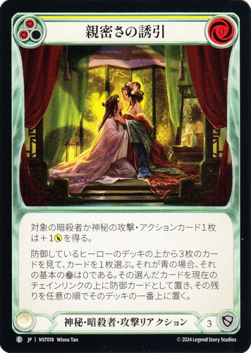 ![]() ![]() | MST018 親密さの誘引 攻撃リアクション 霧隠の秘境 C クラス:神秘・暗殺者 ピッチ値:(赤)(赤) リソースポイント:赤0 DEF:3 カラーストリップ:黄 対象の暗殺者か神秘の攻撃・アクションカード1枚は+1ATKを得る。 防御しているヒーローのデッキの上から3枚のカードを見て、カードを1枚選ぶ。それが青の場合、それを基本のDEFは0である。その選んだカードを現在のチェインリンクの上に防御カードとして置き、その残りを任意の順でそのデッキの一番上に置く。 illust:Wisnu Tan |