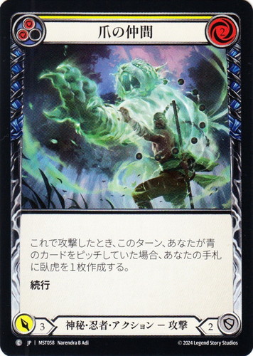 ![]() ![]() | MST058 爪の仲間 アクション 霧隠の秘境 C クラス:神秘・忍者 サブタイプ:攻撃 ピッチ値:(赤)(赤) リソースポイント:赤2 ATK:3 DEF:2 カラーストリップ:黄 これで攻撃したとき、このターン、あなたが青のカードをピッチしていた場合、あなたの手札に臥虎を1枚作成する。 続行 illust:Narendra B Adi |