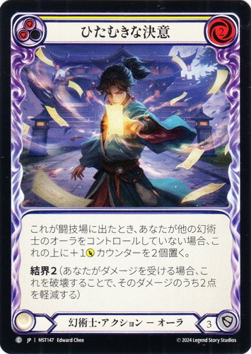 ![]() ![]() | MST147 ひたむきな決意 アクション 霧隠の秘境 C クラス:幻術士 サブタイプ:オーラ ピッチ値:(赤)(赤) リソースポイント:赤2 DEF:3 カラーストリップ:黄 これが闘技場に出たとき、あなたが他の幻術士のオーラをコントロールしていない場合、これの上に+1ATKカウンターを2個置く。 結界2(あなたがダメージを受ける場合、これを破壊することで、そのダメージのうち2点を軽減する) illust:Edward Chee |