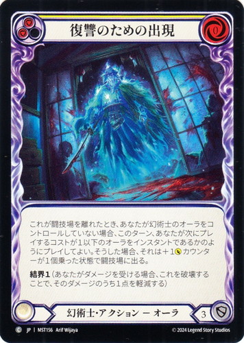 ![]() ![]() | MST156 復讐のための出現 アクション 霧隠の秘境 C クラス:幻術士 サブタイプ:オーラ ピッチ値:(赤)(赤) リソースポイント:赤0 DEF:3 カラーストリップ:黄 これが闘技場を離れたとき、あなたが幻術士のオーラをコントロールしていない場合、このターン、あなたが次にプレイするコストが1以下のオーラをインスタントであるかのようにプレイしてよい。そうした場合、それは+1ATKカウンターが1個乗った状態で闘技場に出る。 結界1(あなたがダメージを受ける場合、これを破壊することで、そのダメージのうち1点を軽減する) illust:Arif Wijaya |