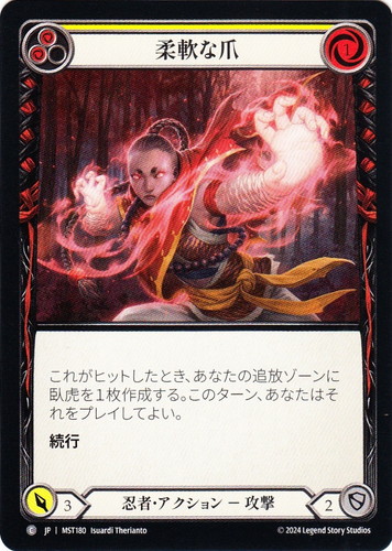 ![]() ![]() | MST180 柔軟な爪 アクション 霧隠の秘境 C クラス:忍者 サブタイプ:攻撃 ピッチ値:(赤)(赤) リソースポイント:赤1 ATK:3 DEF:2 カラーストリップ:黄 これがヒットしたとき、あなたの追放ゾーンに臥虎を1枚作成する。このターン、あなたはそれをプレイしてよい。 続行 illust:Isuardi Therianto |