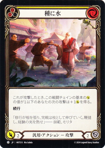 ![]() ![]() | MST213 種に水 アクション 霧隠の秘境 C クラス:汎用 サブタイプ:攻撃 ピッチ値:(赤)(赤) リソースポイント:赤1 ATK:2 DEF:2 カラーストリップ:黄 これが攻撃したとき、この戦闘チェインの基本のATKの値が1以下のあなたの次の攻撃は+1ATKを得る。 続行 「修行が根を張り、実戦は枝として伸びていく。鞭撻し、経験の実を熟せ」ー師範、モリタ illust:Rio Sabda |
