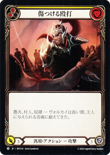 ![]() ![]() | MST216 傷つける殴打 アクション 霧隠の秘境 C クラス:汎用 サブタイプ:攻撃 ピッチ値:(赤)(赤) リソースポイント:赤0 ATK:3 DEF:3 カラーストリップ:黄 農夫、村人、奴隷ーヴォルカイは長い間、主人に与えられる苦痛に耐えてきた。 illust:Sonia Sandoval |