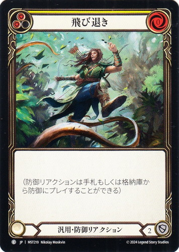 ![]() ![]() | MST219 飛び退き 防御リアクション 霧隠の秘境 C クラス:汎用 ピッチ値:(赤)(赤) リソースポイント:赤0 DEF:2 カラーストリップ:黄 (防御リアクションは手札もしくは格納庫から防御にプレイすることができる) illust:Nikolay Moskvin |