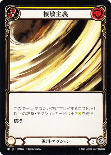 ![]() ![]() | MST222 機敏主義 アクション 霧隠の秘境 C クラス:汎用 ピッチ値:(赤)(赤) リソースポイント:赤0 DEF:2 カラーストリップ:黄 このターン、あなたが次にプレイするコストが1以下の攻撃・アクションカードは+2ATKを得る。 続行 illust:Fedor Barkhatov |