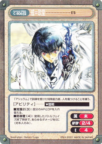 ![]() ![]() | L-867 戒=玖堂 リーダー Gファンタジー構築済みデッキ EX(foil) タイトル:E’S 属性:未 HP:25 ■念動力③:指定キャラ1体を待機スペースに移動させる。 ■能力1②:敵リーダーまたはキャラ1体に2ダメージ。自分のHP-2。 ■反撃レベル⑤:敵キャラからアタックを受けた場合、AP5で反撃。 ※このカードはダメージ2以下のアビリティアタックの対象にならない。 「アシュラム」で訓練を受けた特殊能力者。人を傷つけることを嫌う。 illustration:Satoru Yuiga |