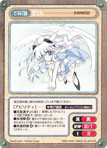 ![]() ![]() | C-991 まりん キャラ Gファンタジー Edition C タイトル:SHERWOOD 属性:異 AP:2 DP:1 E:3 スキル:飛び道具 自フィールド上に「アビス」がいる場合は2/2 ■元気満タン(3):使用したバトルフェイズ終了時まで、自分に+2/+2。 ■水泡壁④:敵キャラ1体からの、自リーダーまたはキャラ1体へのあらゆるダメージを0に。 ■氷嵐裂破④:敵リーダーまたはキャラ1体に2ダメージ。 魔王様を慕い旅のお供をしている下僕(?)その1。 illustration:Satoru Yuiga |