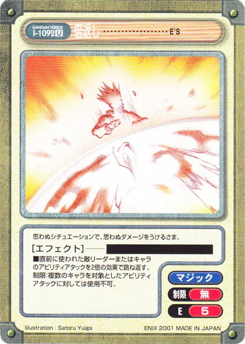 ![]() ![]() | I-1092 倍返し アイテム Gファンタジー Edition U タイトル:E’S 属性:マジック 制限:無 E:5 ■直前に使われた敵リーダーまたはキャラのアビリティアタックを2倍の効果で跳ね返す。 制限:複数のキャラを対象としたアビリティアタックに対しては使用不可。 思わぬシチュエーションで、思わぬダメージをうけるさま。 illustration:Satoru Yuiga |