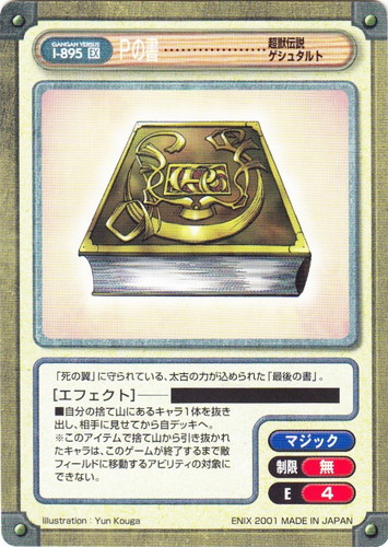 ![]() ![]() | I-895 Pの書 アイテム Gファンタジー構築済みデッキ EX タイトル:超獣伝説ゲシュタルト 属性:マジック 制限:無 E:4 ■自分の捨て山にあるキャラ1体を抜き出し、相手に見せてから自デッキへ。 ※このアイテムで捨て山から引き抜かれたキャラは、このゲームが終了するまで敵フィールドに移動するアビリティの対象にできない。 「死の翼」に守られている、太古の力が込められた「最後の書」。 illustration:Yun Kouga |