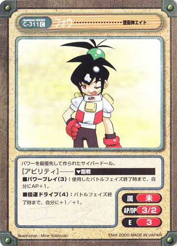 ![]() ![]() | C-311 フォウ キャラ SECOND Versus C タイトル:護衛神エイト 属性:未 AP:3 DP:2 E:3 スキル:臨戦 ■パワープレイ(3):使用したバトルフェイズ終了時まで、自分にAP+1。 ■倍速ドライブ(4):バトルフェイズ終了時まで、自分に+1/+1。 パワーを最優先して作られたサイバードール。 illustration:Mine Yoshizaki |