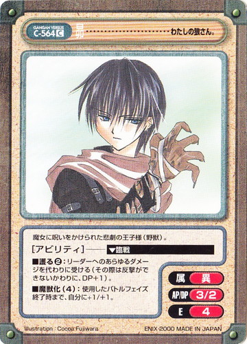 ![]() ![]() | C-040 犬川荘助 キャラ ガンガンヴァーサス ブースターパック C タイトル:里見☆八犬伝 属性:過 AP:3 DP:3 E:4 スキル:臨戦 ■女装④:使用したバトルフェイズ終了時まで、すべての敵キャラに-1/-1。 腕は立つが天然ボケ気味の「義」の犬士。 illustration:Natsuki Yoshimura |