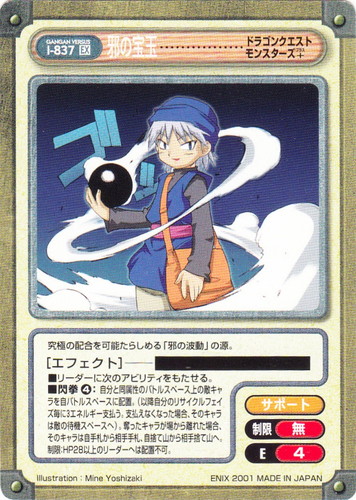 ![]() ![]() | I-837 邪の宝玉 アイテム 少年ガンガン構築済みデッキ EX タイトル:ドラゴンクエストモンスターズ+ 属性:サポート 制限:無 E:4 ■リーダーに次のアビリティをもたせる。 ■閃拳④:自分と同属性のバトルスペース上の敵キャラを自バトルスペースに配置。(以降自分のリサイクルフェイズに3エネルギー支払う。支払えなくなった場合、そのキャラは敵の待機スペースへ)。奪ったキャラが場から離れた場合、そのキャラは自手札から相手手札、自捨て山から相手捨て山へ。 制限:HP28以上のリーダーへは配置不可。 究極の配合を可能たらしめる「邪の波動」の源。 illustration:Mine Yoshizaki |