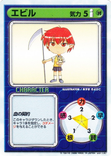 ![]() ![]() | エビル キャラ ver.1.02 属性:賢 コスト:[白] 気力:5 力:2 早:2 賢:3 根:1 感:3 血の契約 このキャラがダウンしたとき、キャラ1体を指定し、3ダメージを与えることができる ILLUSTRATOR:あずま きよひこ |