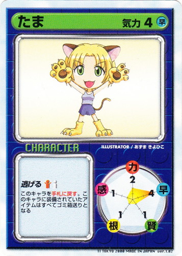 ![]() ![]() | たま キャラ ver.1.02 属性:早 気力:4 力:2 早:4 賢:1 根:1 感:1 逃げる[赤][白] このキャラを手札に戻す。このキャラに装備されていたアイテムはすべてゴミ箱送りとなる ILLUSTRATOR:あずま きよひこ |