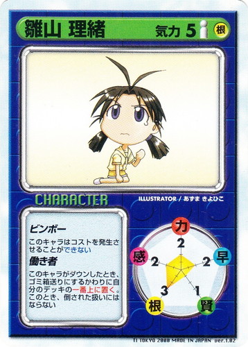 ![]() ![]() | 柏木初音 キャラ ver.1.02 属性:感 コスト:[白] 気力:5 力:1 早:2 賢:2 根:3 感:4 子鬼化[白] このキャラに力+1早+1する(1ターンに1回まで使用可能) お弁当[赤] キャラ1体の気力を1点回復する ILLUSTRATOR:あずま きよひこ |