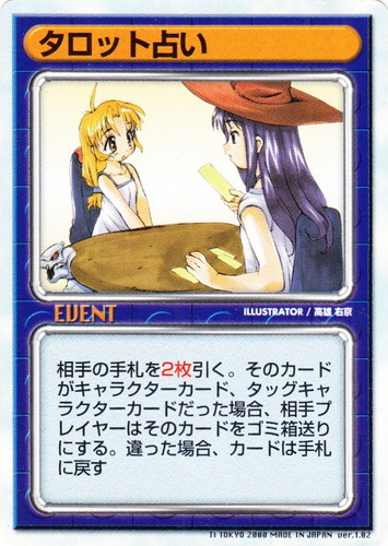 ![]() ![]() | タロット占い イベント ver.1.02 相手の手札を2枚引く。そのカードがキャラクターカード、タッグキャラクターカードだった場合、相手プレイヤーはそのカードをゴミ箱送りにする。違った場合、カードは手札に戻す ILLUSTRATOR:高雄右京 |