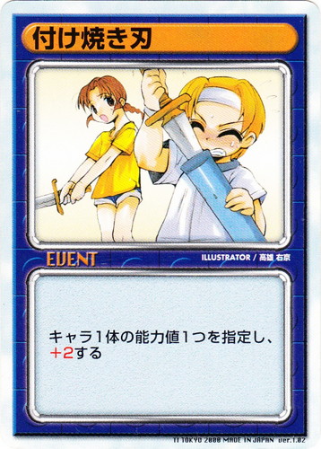 ![]() ![]() | 付け焼き刃 イベント ver.1.02 キャラ1体の能力値1つを指定し、+2する ILLUSTRATOR:高雄右京 |