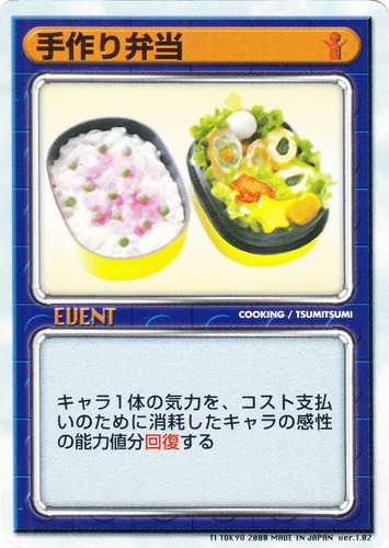 ![]() ![]() | 手作り弁当 イベント ver.1.02 コスト:[赤] キャラ1体の気力を、コスト支払いのために消耗したキャラの感性の能力値分回復する ILLUSTRATOR:COOKING/TSUMITSUMI |