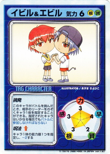 ![]() ![]() | イビル&エビル タッグキャラ ver.1.02 属性:根/賢 気力:6 力:3 早:4 賢:2 根:3 感:3 挑発 このキャラがバトルを挑んだとき、相手のリーダーをのぞくキャラ1体を指定することができる。指定されたキャラはいかなる場合でもバトルに参加しなければならない 呪法[赤] キャラ1体の能力値1つを指定し、-2する ILLUSTRATOR:あずま きよひこ |