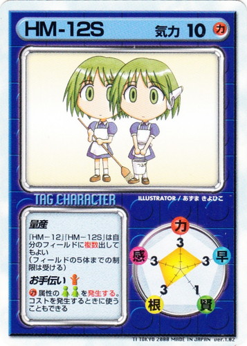 ![]() ![]() | HM-12 キャラ ver.1.02 属性:力 気力:6 力:2 早:2 賢:1 根:3 感:2 量産 『HM-12』『HM-12S』は自分のフィールドに複数出してもよい(フィールドの5体までの制限は受ける) ILLUSTRATOR:あずま きよひこ |