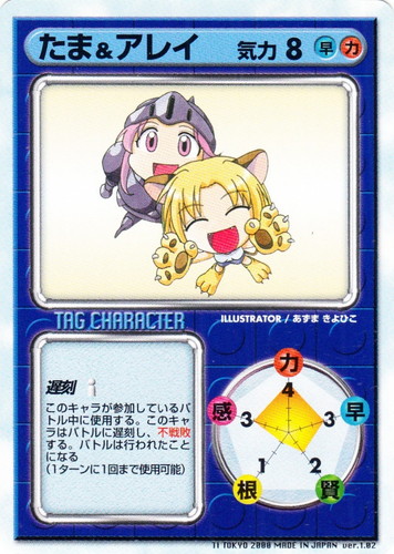![]() ![]() | たま&アレイ タッグキャラ ver.1.02 属性:早/力 気力:8 力:4 早:3 賢:2 根:1 感:3 遅刻[白] このキャラが参加しているバトル中に使用する。このキャラはバトルに遅刻し、不戦敗する。バトルは行われたことになる(1ターンに1回まで使用可能) ILLUSTRATOR:あずま きよひこ |
