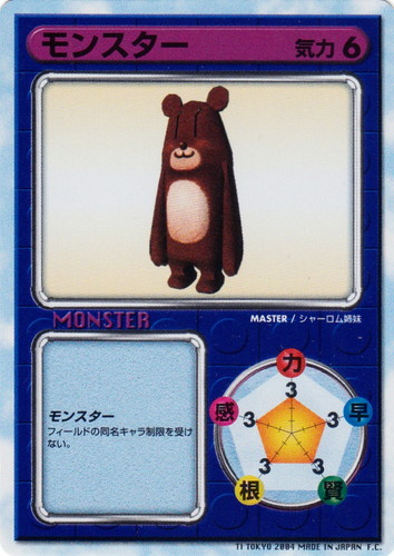 ![]() ![]() | モンスター モンスター フルキャラエディション 気力:6 力:3 早:3 賢:3 根:3 感:3 MASTER:シャーロム姉妹 モンスター フィールドの同名キャラ制限を受けない |